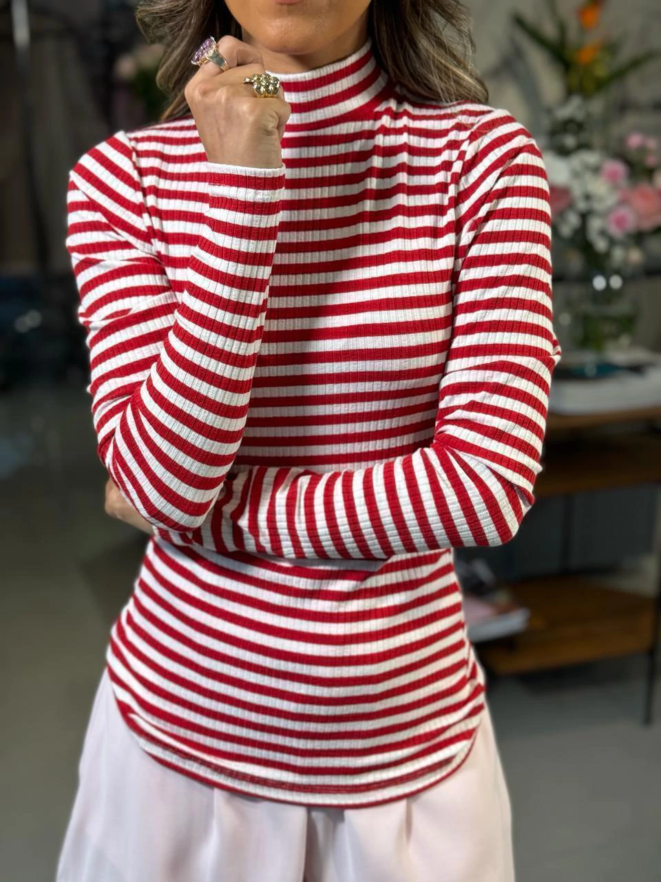A Blusa Feminina Canelada de Gola Alta é perfeita para sobrepor com casacos e aquecer o look nesse inverno.