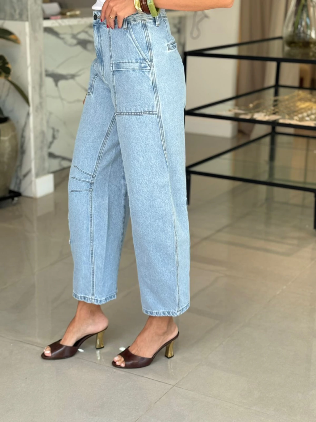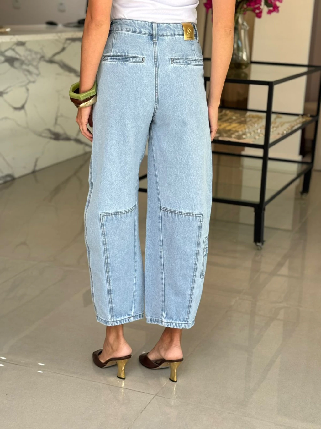 Calça com modelagem Balloon, pernas largas com comprimento mais curto e cintura intermediária. Bolsos sobrepostos frontais, bolsos embutidos no traseiro e bolsos utilitários nas pernas.