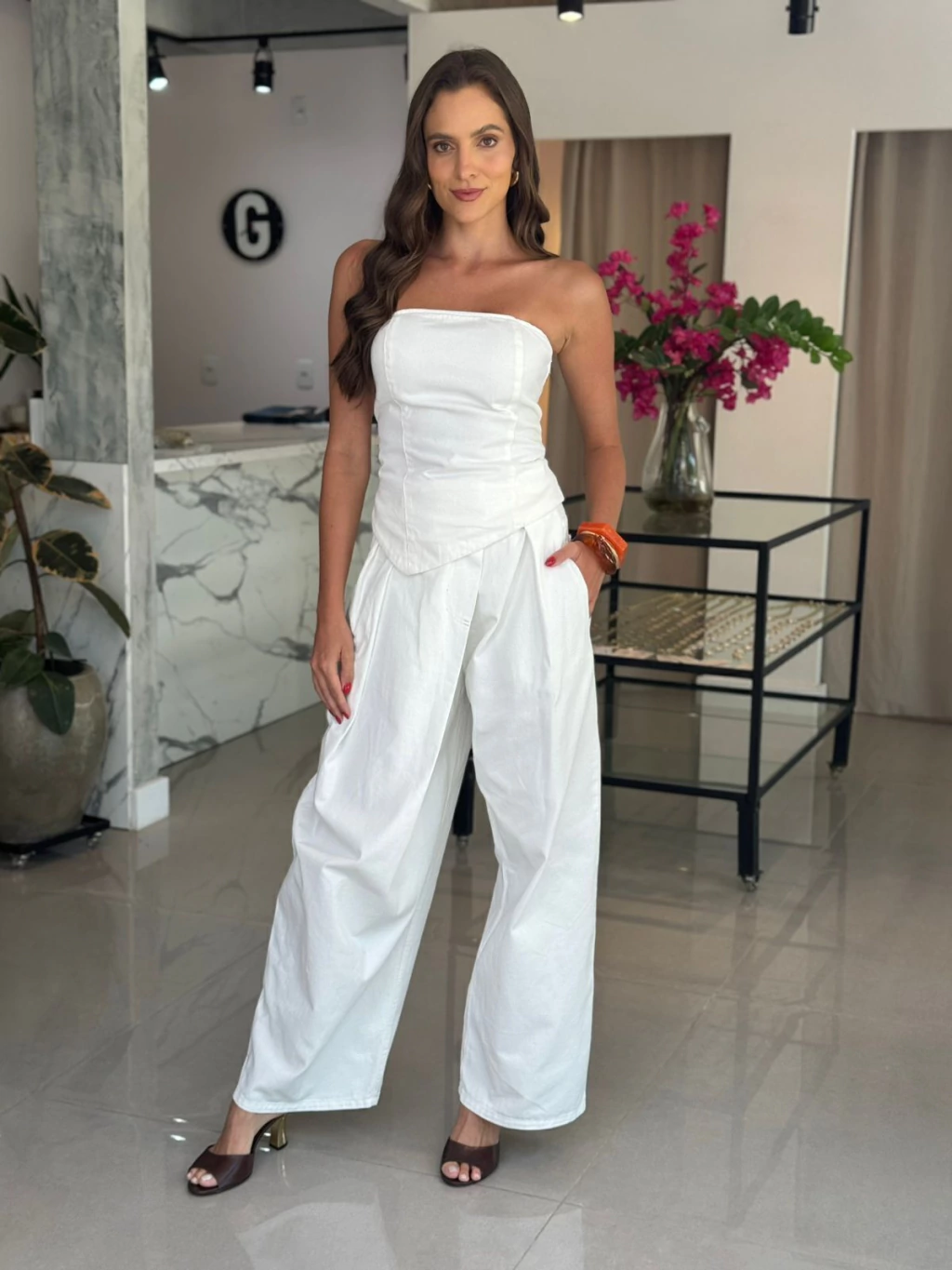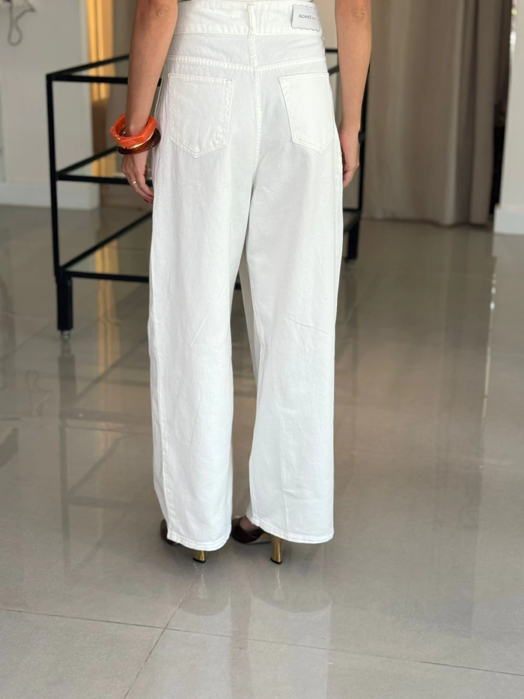 Calça com modelagem wide, pernas largas e cintura intermediária. Bolsos laterais e bolsos traseiros funcionais.