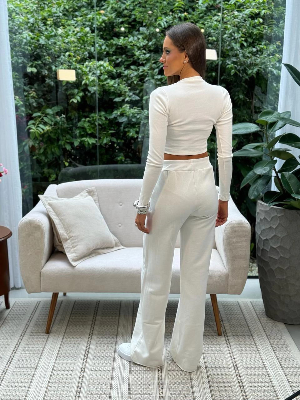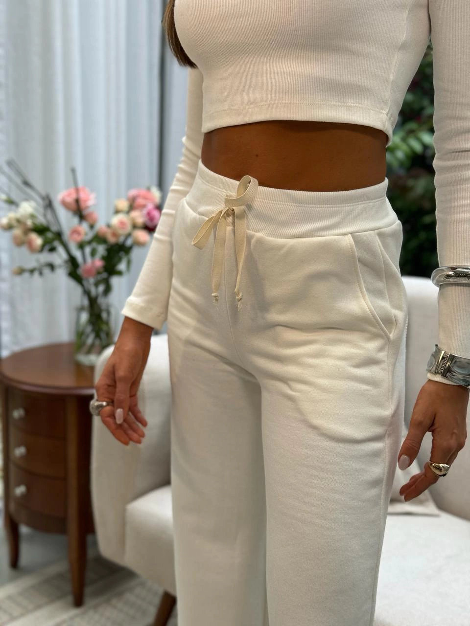 Calca Wide Leg de Moletom Comfy Feminina | Bolso Faca | Barra com Corte a Fio | Amarração decorativa no Cós