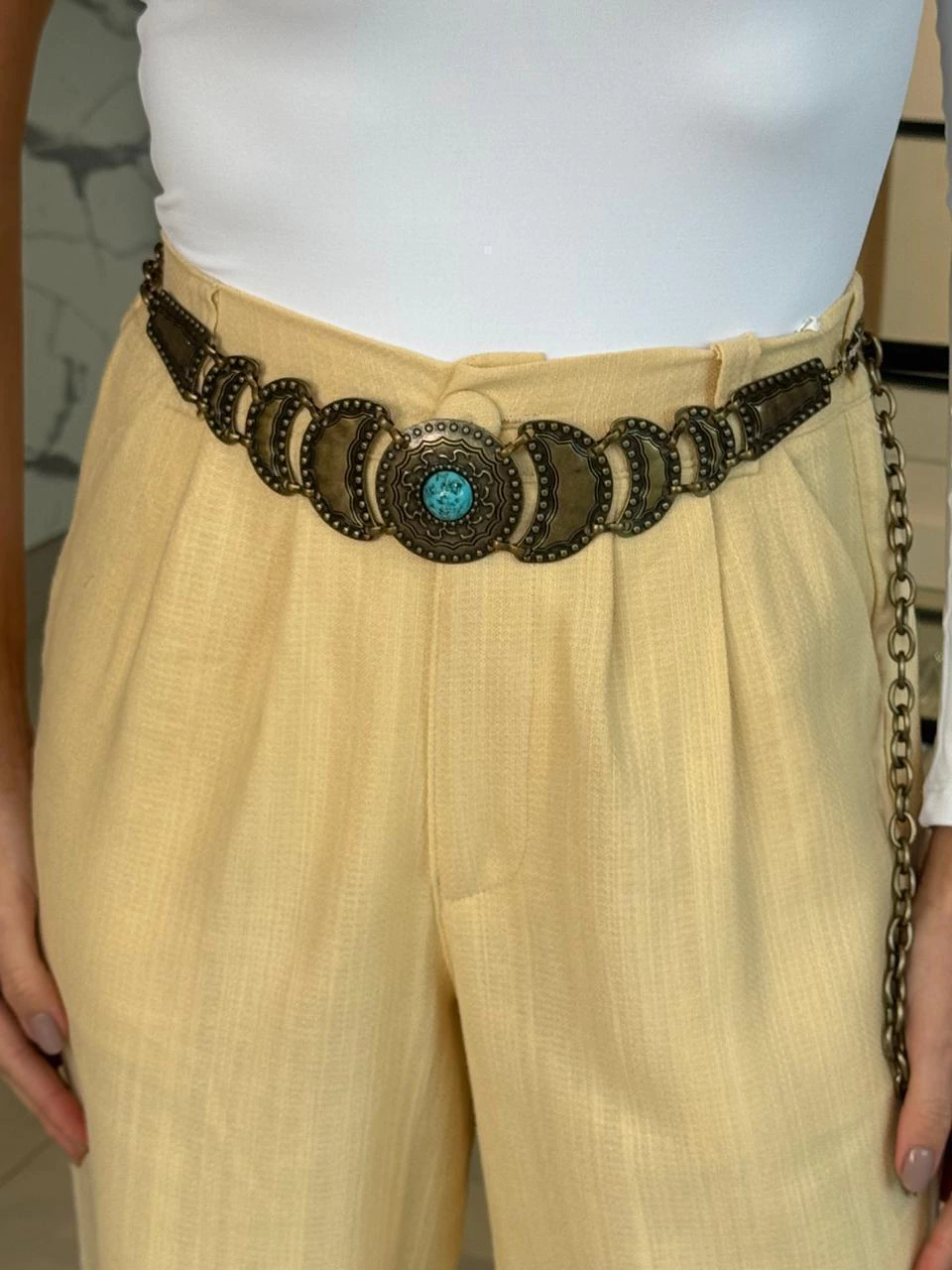 Cinto Corrente com Placas em Metal Meia Lua e Redondo com Pedra Azul